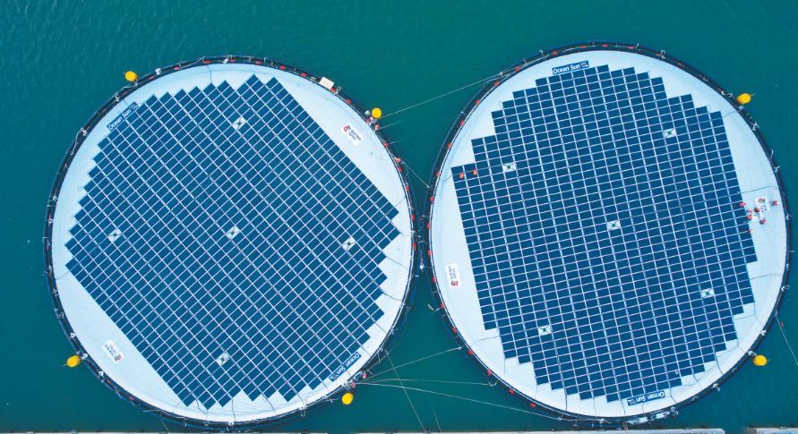 該項目位于山東省煙臺市海陽市南側(cè)海域,離岸30千米,水深30米。本次建設(shè)的500千瓦漂浮式海上光伏由兩個環(huán)形浮體單元組成,在直徑53米,面積相當于4個標準籃球場的浮體單元上,共安裝了770塊光伏組件。該項目驗證了浮體、錨固、發(fā)電組件抗風(fēng)浪能力以及風(fēng)光同場并網(wǎng)的技術(shù)可行性。